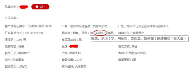 目前市场鲍鱼罐头常见种类为:烧汁鲍鱼罐头、清汤鲍鱼罐头,其特点就是罐装汤汁的区别,针对如何解决鲍鱼口感体验这块却从生产开始至今毫无改善,有的商家更是放弃了对产品的研发,通过用香精(鸡汤粉)勾兑汤汁来使利益最大化,以下为天猫销量排名前列的某品牌,产品配料说明图,试问这样的“产品”,你敢买吗?。